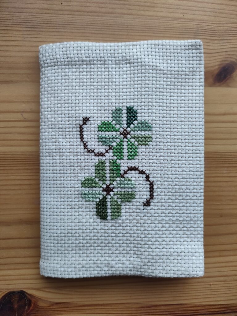 • 昨日クロスステッチ刺繍をして、ふたつの四つ葉のクローバーを刺した。練習のつもりだったけど、まあまあ出来が良いので、手縫いで、おくすり手帳カバーに仕立てた。